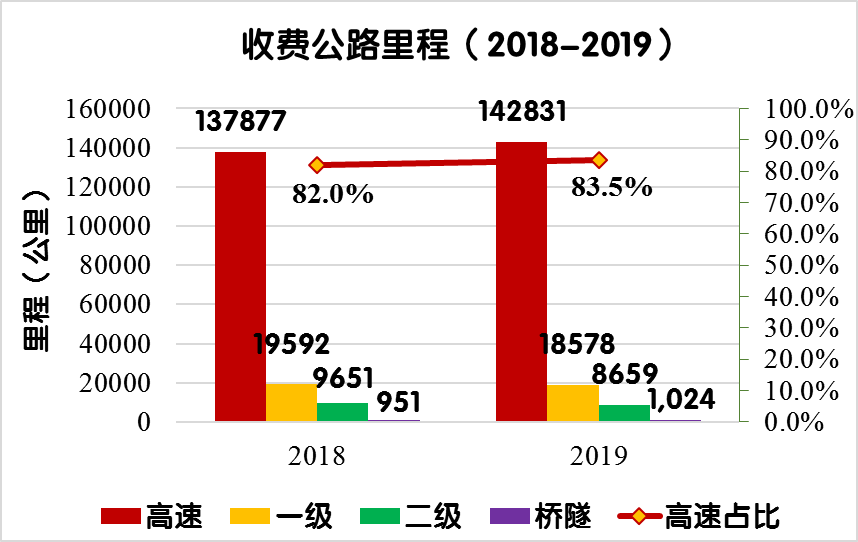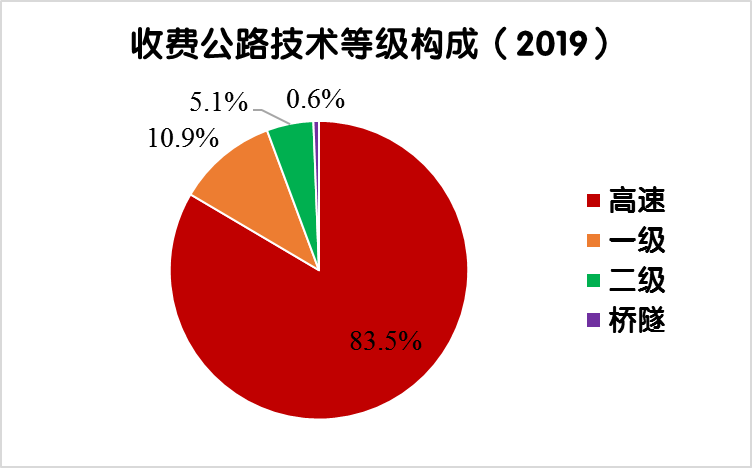 2019年末,全國(guó)收費(fèi)公路里程17.11萬(wàn)公里,占公路總里程501.25萬(wàn)公里的3.4%。其中,高速公路14.28萬(wàn)公里,一級(jí)公路1.86萬(wàn)公里,二級(jí)公路0.87萬(wàn)公里,獨(dú)立橋梁及隧道1024公里,占比分別為83.5%、10.9%、5.1%和0.6%。