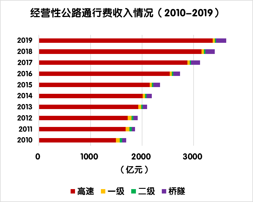 與上年相比,經(jīng)營(yíng)性公路車(chē)輛通行費(fèi)總收入由3410.1億元增加到3628.9億元,凈增218.7億元,增長(zhǎng)6.4%。其中,高速公路由3152.4億元增加到3368.1億元,凈增215.7億元,增長(zhǎng)6.8%;一級(jí)公路由48.0億元減少到41.9億元,凈減6億元,下降12.6%;二級(jí)公路由25.4億元減少到23.5 億元,凈減1.9億元,下降7.6%;獨(dú)立橋梁及隧道由184.3億元增加到195.3億元,凈增11億元,增長(zhǎng)6.0%。
