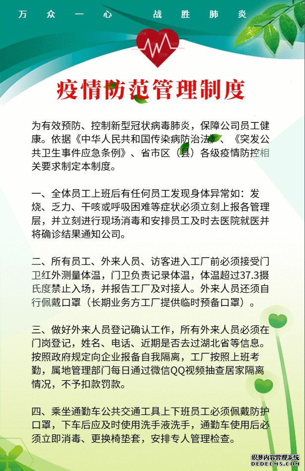 當(dāng)前,新型冠狀病毒感染的肺炎疫情嚴(yán)重威脅人民群眾身體健康和生命安全,特別是節(jié)后工業(yè)企業(yè)陸續(xù)復(fù)工復(fù)產(chǎn),容易形成人員集聚,疫情防控形勢(shì)緊迫,責(zé)任重大。企業(yè)必須做好節(jié)后復(fù)工復(fù)產(chǎn)疫情防控工作。
