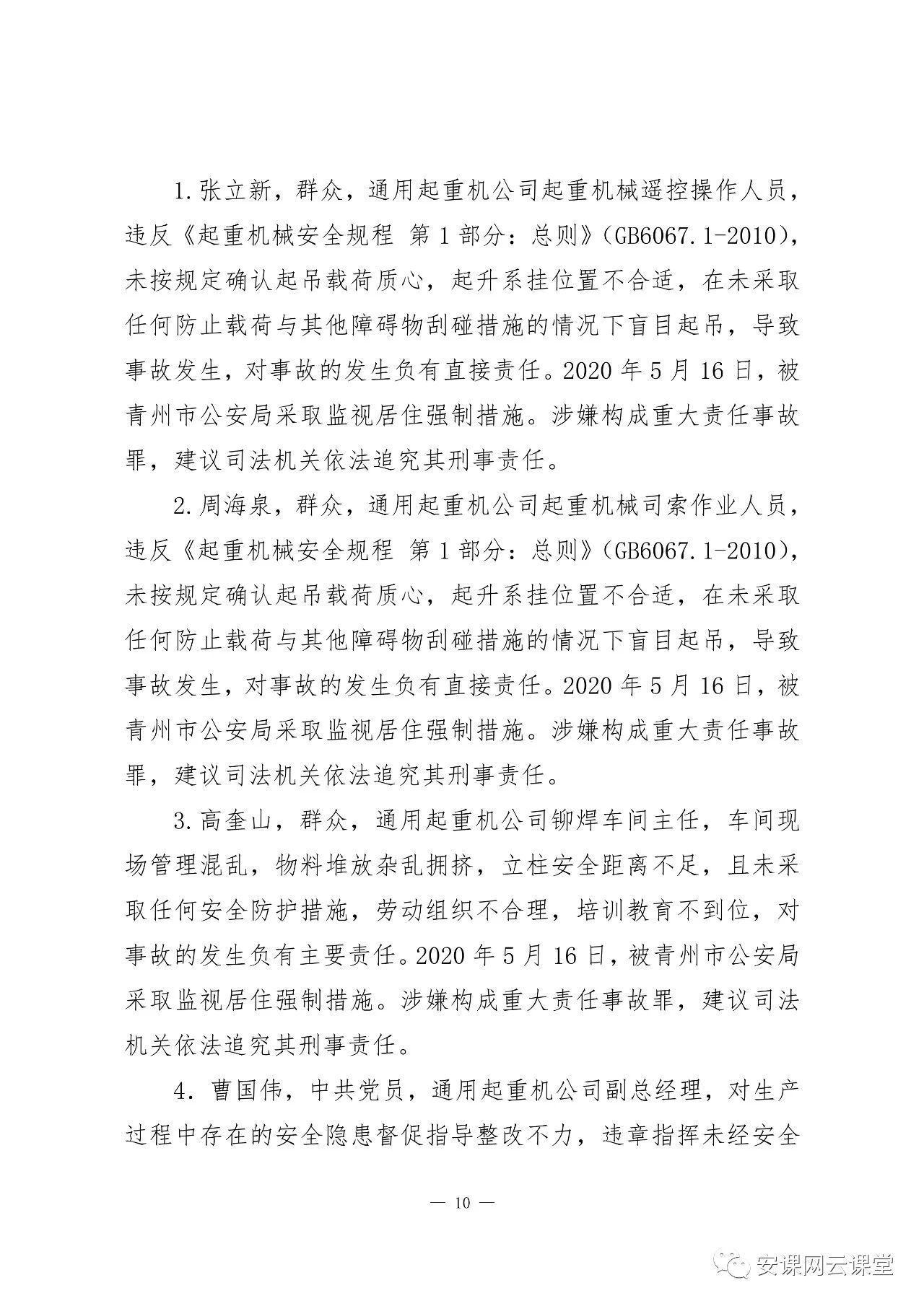 2020年5 月16 日,被青州市公安局采取監(jiān)視居住強制措施。涉嫌構(gòu)成重大責(zé)任事故罪,建議司法機關(guān)依法追究其刑事責(zé)任。建議由青州市紀檢監(jiān)察機關(guān)按規(guī)定及時給予其相應(yīng)的黨紀處分。